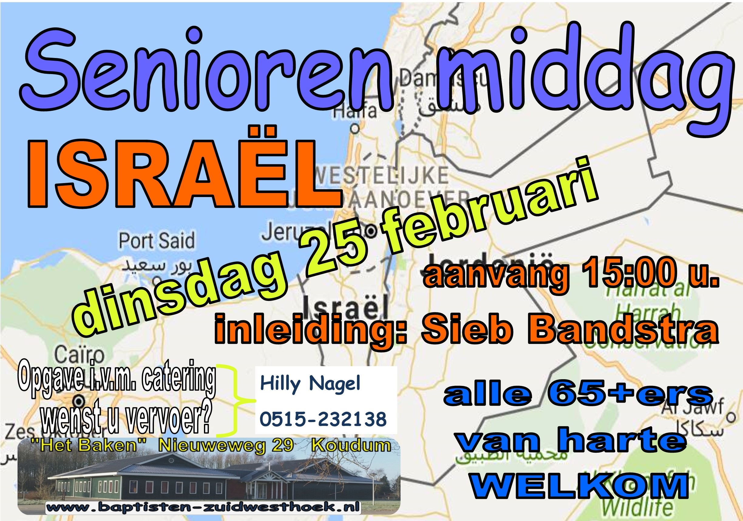 26JAN 2020-02-25 Senioren middag over Israël We gaan wat doen wat we nog nooit eerder gedaan hebben We gaan wat zien wat we nog nooit eerder hebben gezien. Van harte welkom as dinsdag om 15 uur. Israël wat doet het er toe? Post Author: Redactie