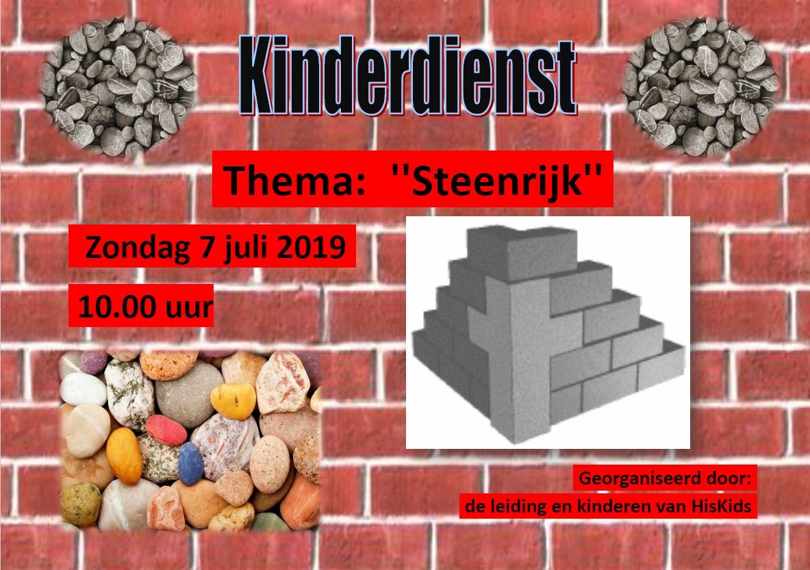 Op zondag 7 juli 2019 nodigen kinderen en leiding van Hiskids u/jou uit voor een kinderdienst om 10.00 uur in “Het Baken” Nieuweweg 29 te Koudum. Het thema van deze dienst is “Steenrijk”! (nav 1 Petrus 2:4/5)